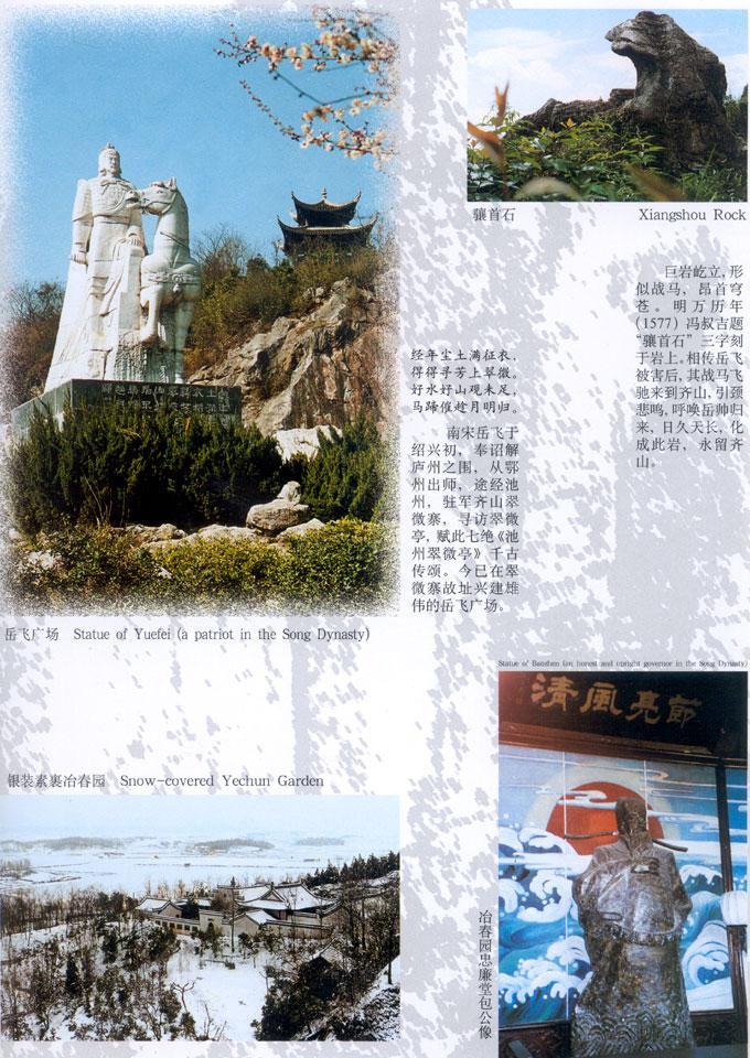 齐山-平天湖风景区位于安徽省池州市城区,规划面积40.6平方公里,由齐山景区、碧山景区、平天湖景区、湿地景区、桃源景区五部分组成,集山、水、湿地于一体,自然景色优美,人文积淀深厚。景区南连九华圣地,西接秋浦仙境,与池州古城、杏花村风景区鼎足相望,是山水文化的缩影,构筑了池州典型的“山水在城中”的特色景观。